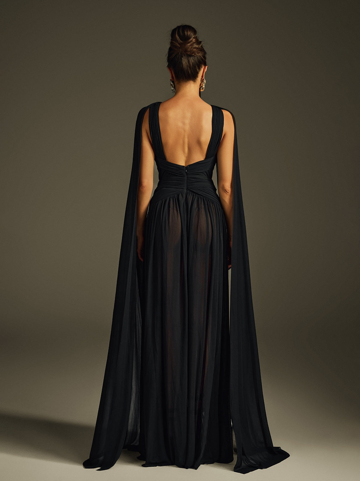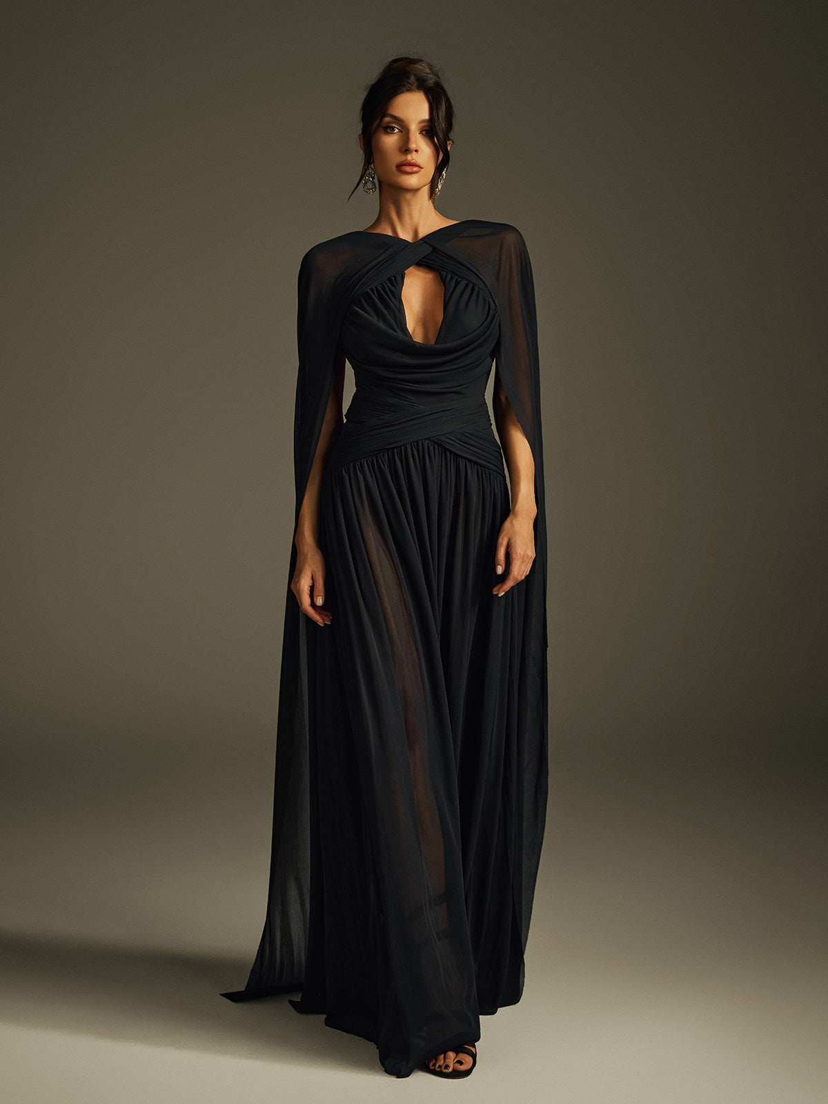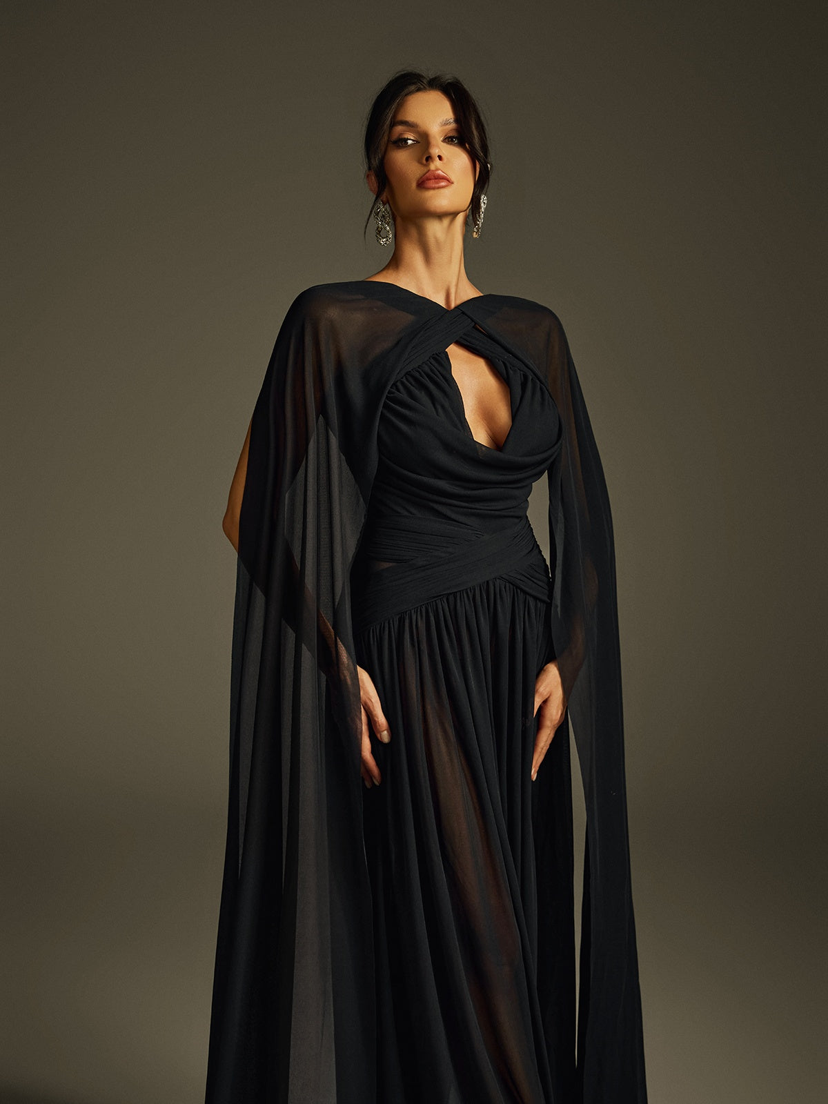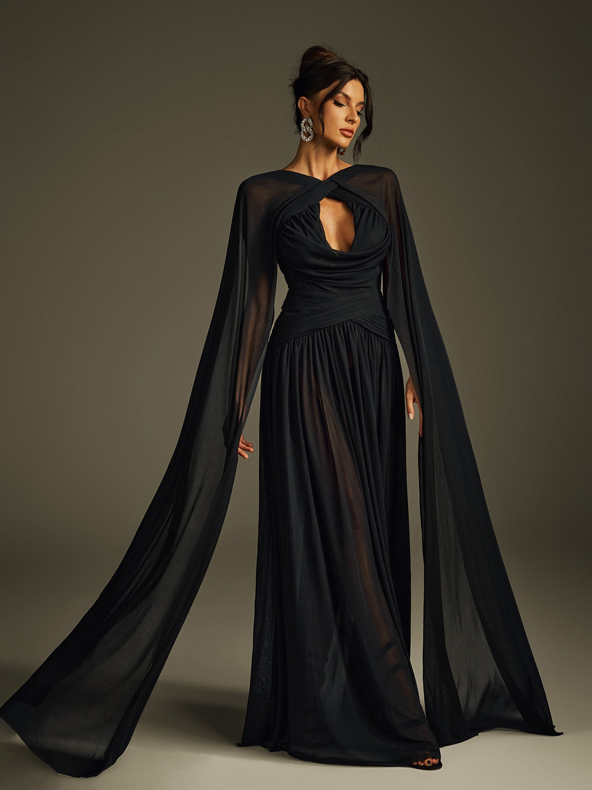 Sukienka maxi Haldris z drapowanymi rękawami i peleryną
