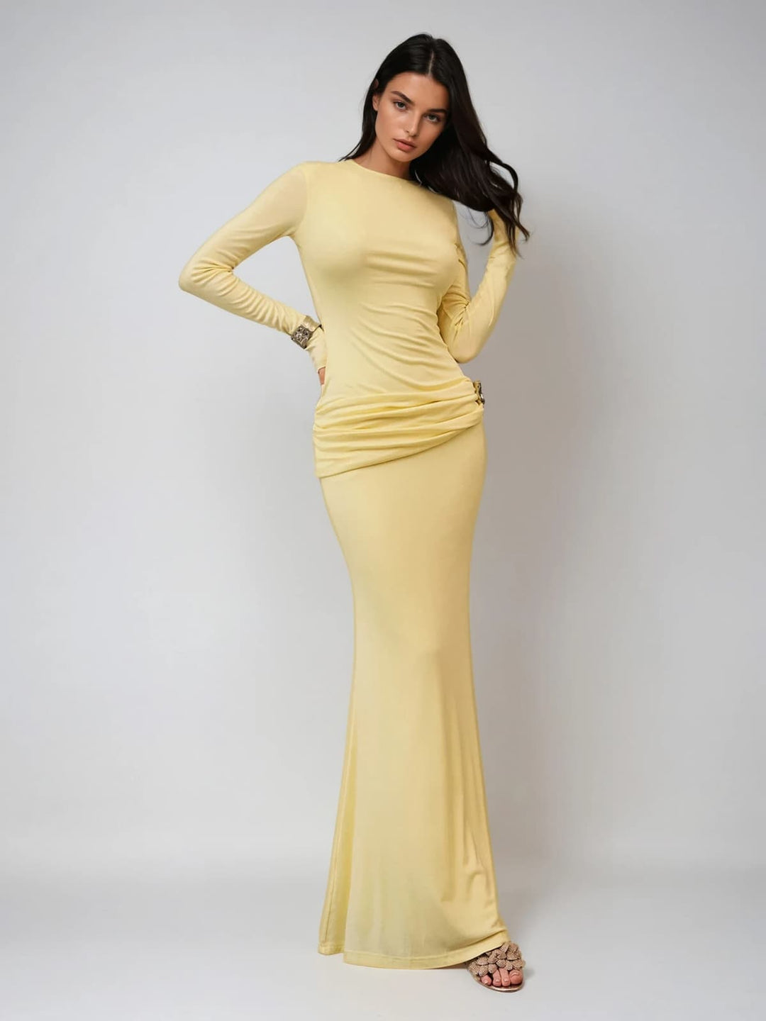 Sukienka maxi Paeltrix z długim rękawem i marszczeniami w kolorze maślanej żółci