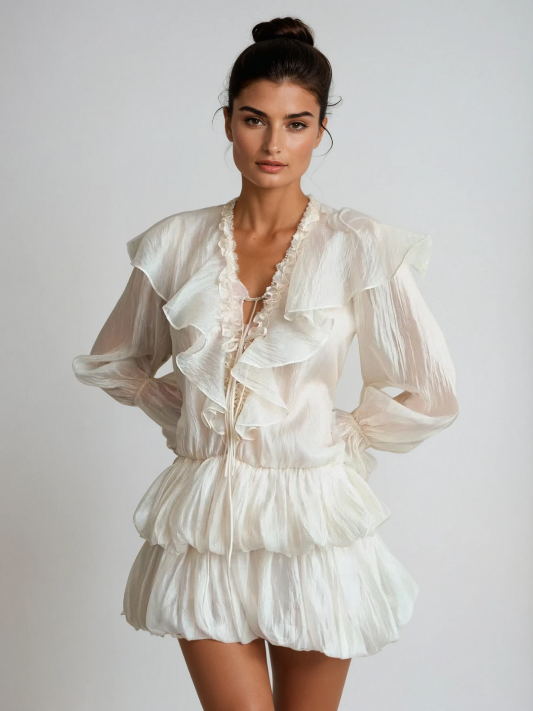 Sukienka mini Kairu z bufiastymi rękawami i falbanką